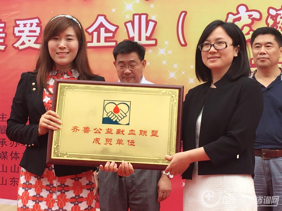 公益中国·山东分会秘书长 山东健康咨询网总监晁玉萍(左)为宏济堂阿胶集团品牌文化总监汤甜颁发和齐鲁公益献血联盟成员单位牌匾。