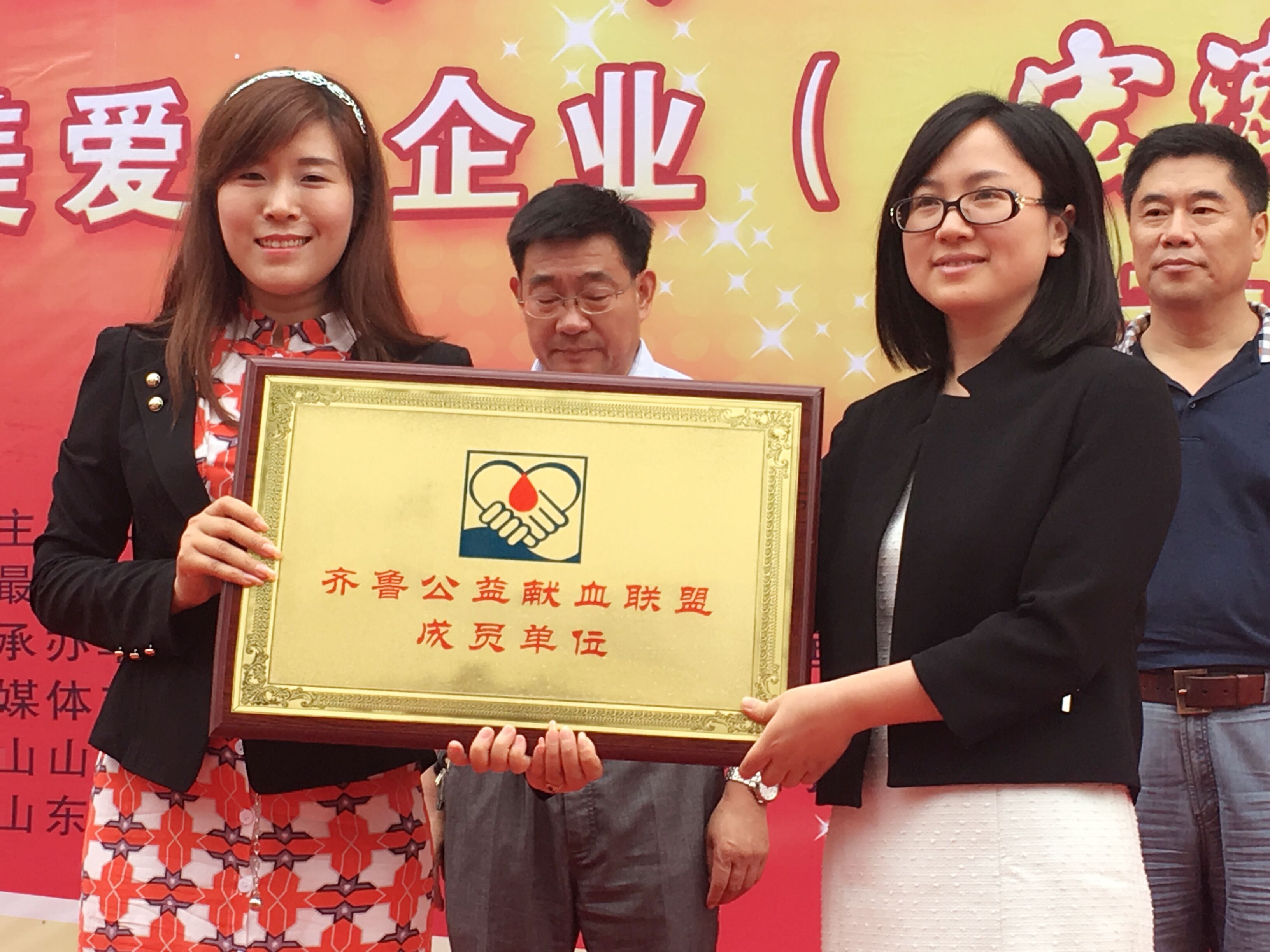 (公益中国·山东分会秘书长 山东健康咨询网总监晁玉萍宏济堂阿胶集团颁发齐鲁公益献血联盟成员单位牌匾)