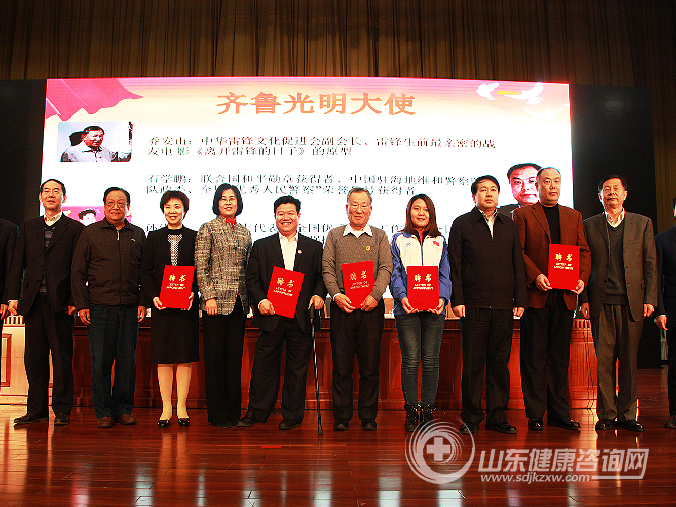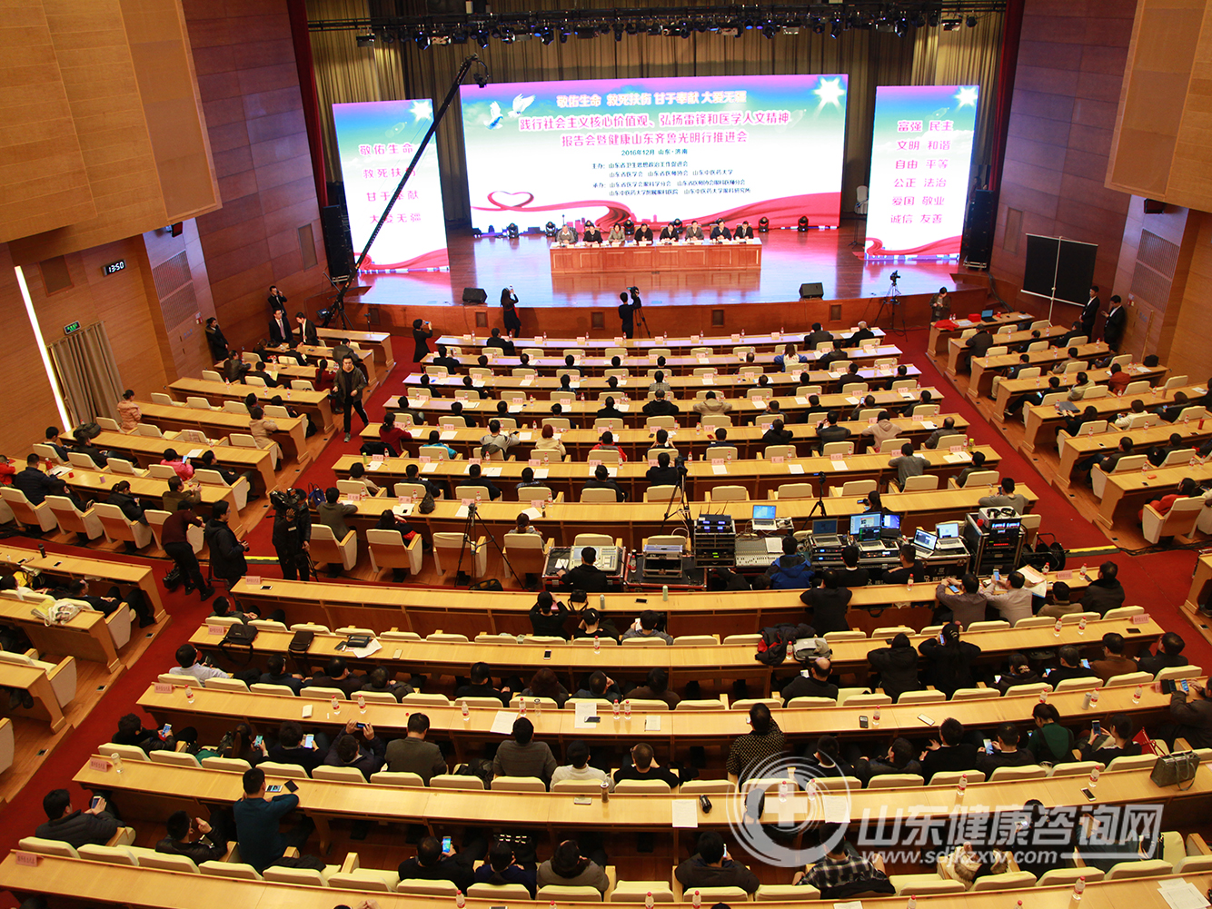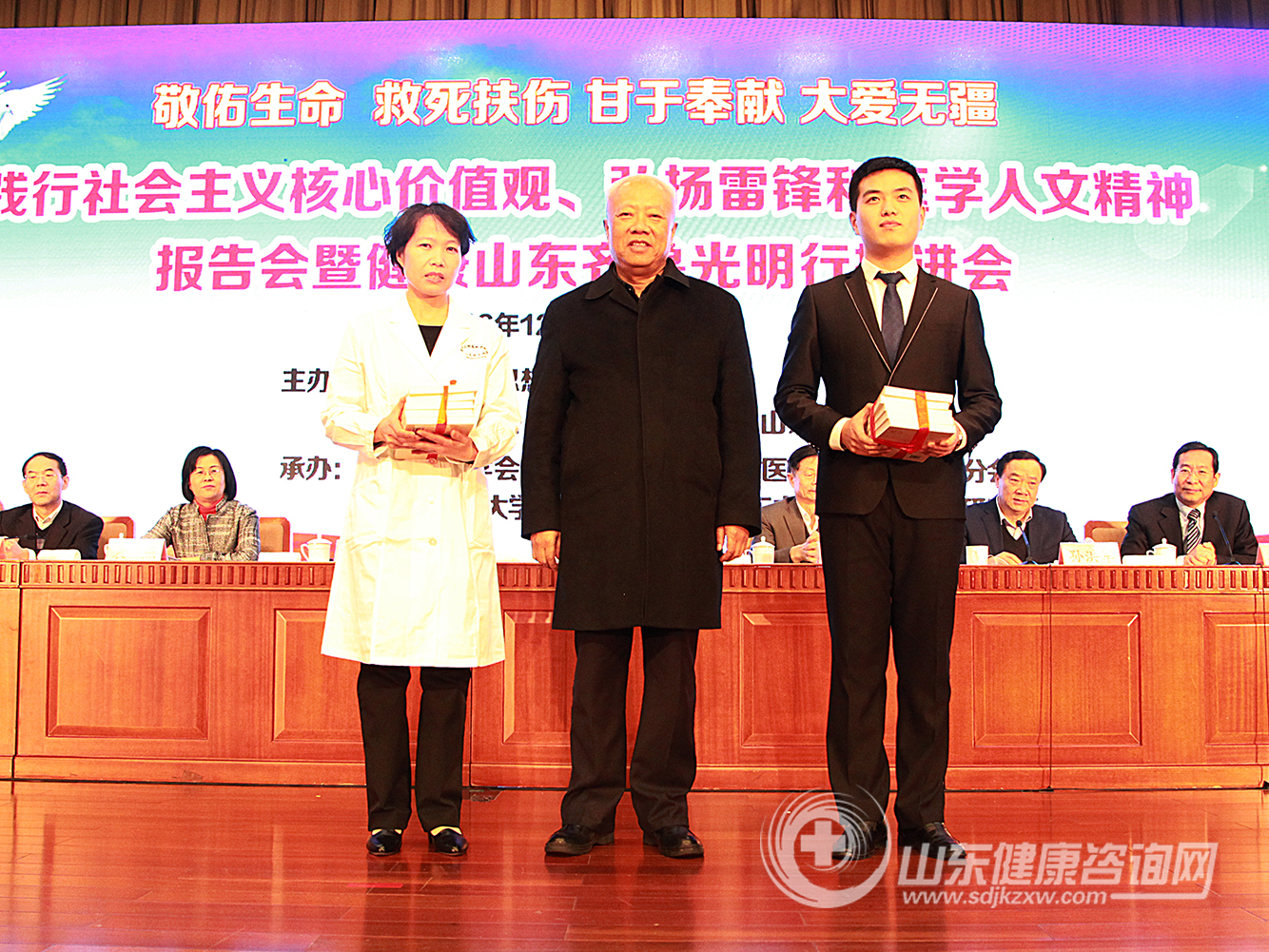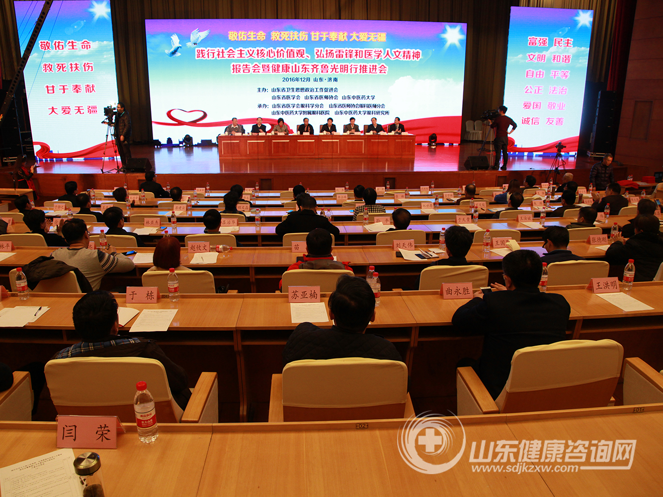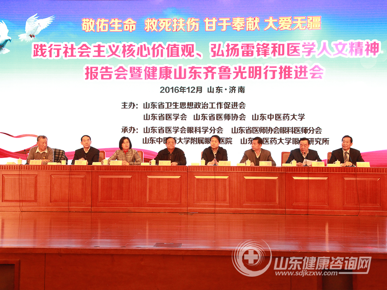 敬佑生命、救死扶伤、甘于奉献、大爱无疆!在雷锋诞辰76周年纪念日到来之际,由山东省卫生思想政治工作促进会、山东省医学会、山东省医师协会、山东中医药大学主办,山东省医学会眼科学分会、山东省医师协会眼科医师分会、山东中医药大学附属眼科医院、山东中医药大学眼科与视光医学院承办的“践行社会主义核心价值观、弘扬雷锋和医学人文精神报告会暨健康山东齐鲁光明行推进会”于2016年12月17日,雷锋同志诞辰76周年纪念日的前一天,在山东大厦隆重召开。