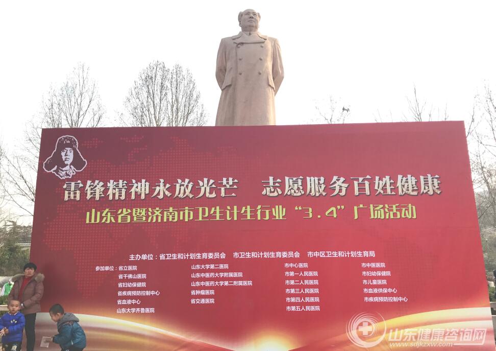 3月4日上午,省卫生计生委、济南市卫生计生委和济南市中区卫生计生局联合在济南市赤霞广场举办以“弘扬雷锋精神 护佑百姓健康”山东卫生计生志愿服务在行动”为主题的学雷锋志愿服务活动。