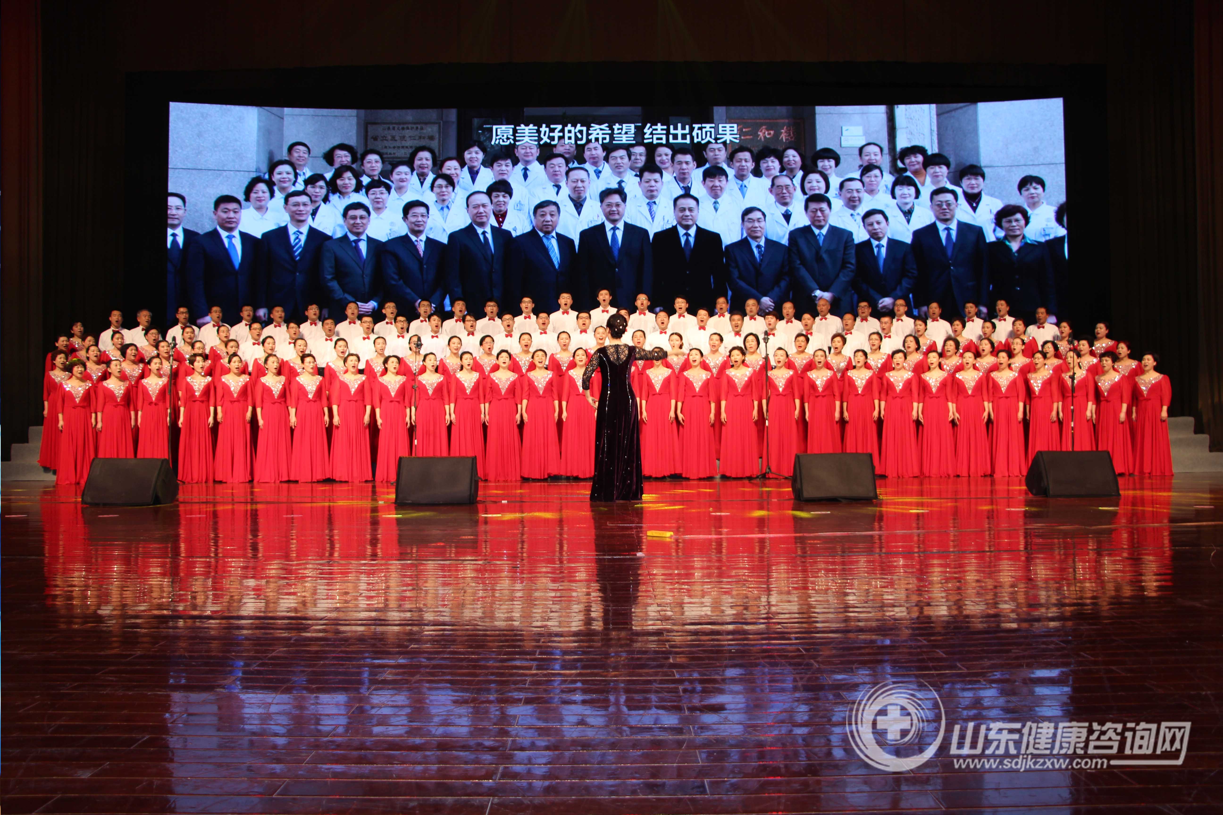 会上,由山东省立医院专家带来的诗朗诵《幸福地穿越时光之海》,深情回顾了医院历史,讴歌了薪火相传的医院精神,展望了幸福美好的省医未来,引发参会人员的共鸣。同时由老中青三代医务人员共同组成的120人合唱团共同演唱了山东省立医院院歌《省医颂》,嘹亮高亢的歌声催人奋进,掀起了会议的高潮。