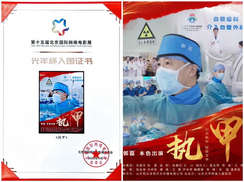 荣获“最佳公益影片”的《执甲》,由山东大学附属儿童医院与山东昭文龙视文化传播有限公司联合策划、出品。影片以山东大学附属儿童医院副院长、血管瘤与介入血管外科创始人郭磊的真实事迹为主线,创新性地构建“白衣执甲、铅衣为铠、与子同袍”三重意象,层层递进刻画出一名医者十年如一日、为儿童健康披坚执锐的动人身影。影片不仅真实再现了郭磊带领团队攻克疾病、推动儿科介入医学发展的专业历程,更透过一枚党徽、一袭白衣、一件重达三十余斤的铅衣,凝练出“人民至上、生命至上”的信仰之光。片中“岂曰无衣,与子同袍”的情感共鸣,让“执甲”二字超越个体,成为整个医疗队伍白衣执甲的医者仁心的无私奉献精神的写照。