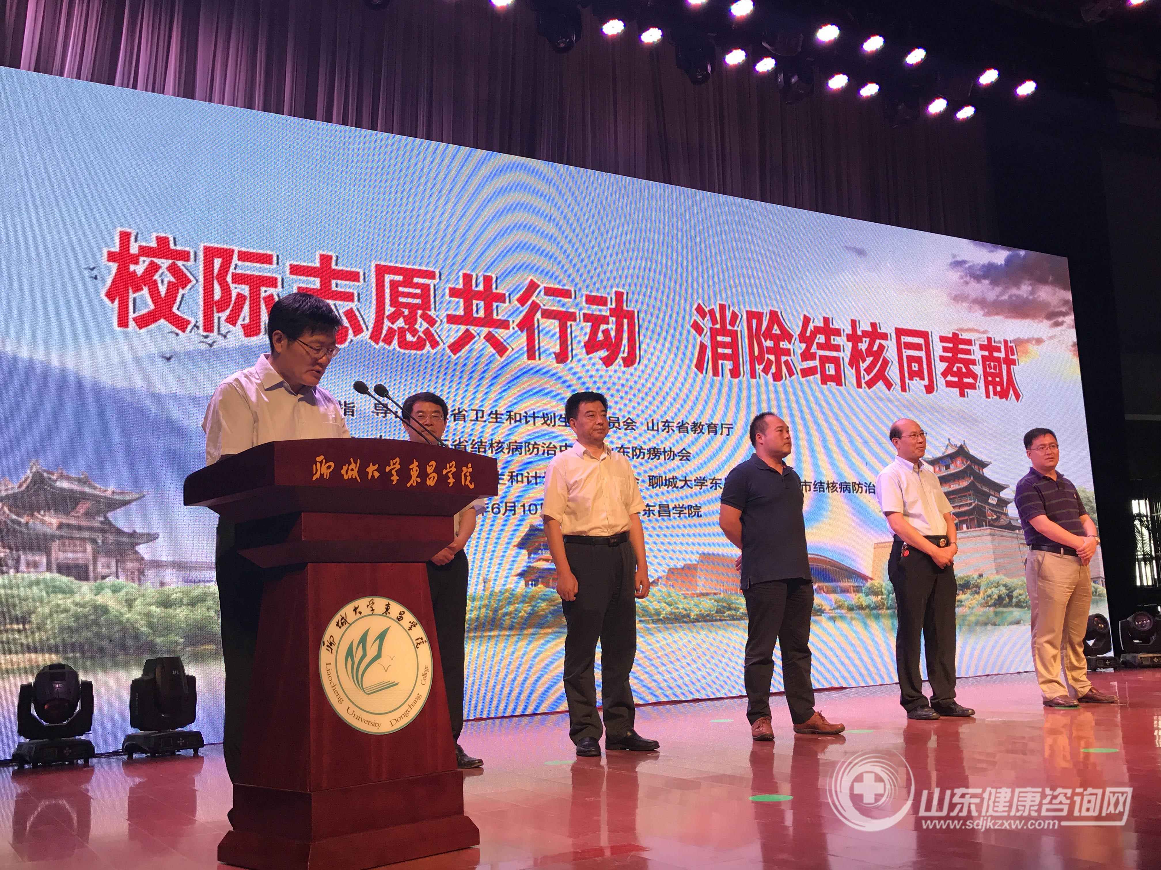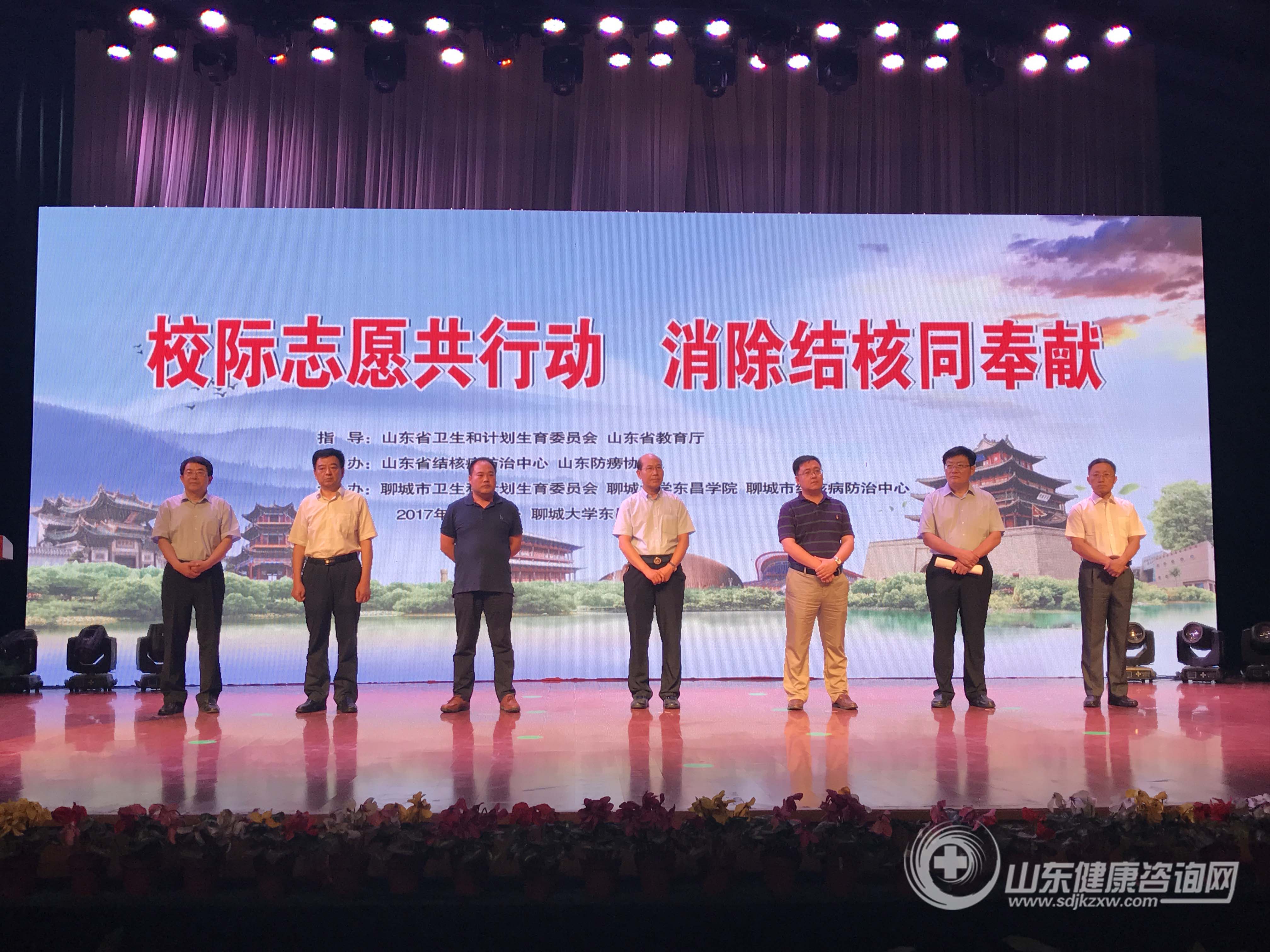 中国疾病预防控制中心结核病控制中心副主任陈明亭,山东省卫生和计划生育委员会疾控处副处长谭成森,山东省教育厅体卫艺处副处长王广森,山东省结核病防治中心主任、山东省胸科医院理事长兼党委书记秦敬民,聊城市卫生和计划生育委员会主任刘德勇,聊城大学东昌学院院长王相水,聊城市结核病防治中心主任付春生等领导出席了活动开幕式。来自全省17市结防机构的工作人员、24所高校的师生志愿者以及聊城大学东昌学院学生代表千余人参加了现场活动。