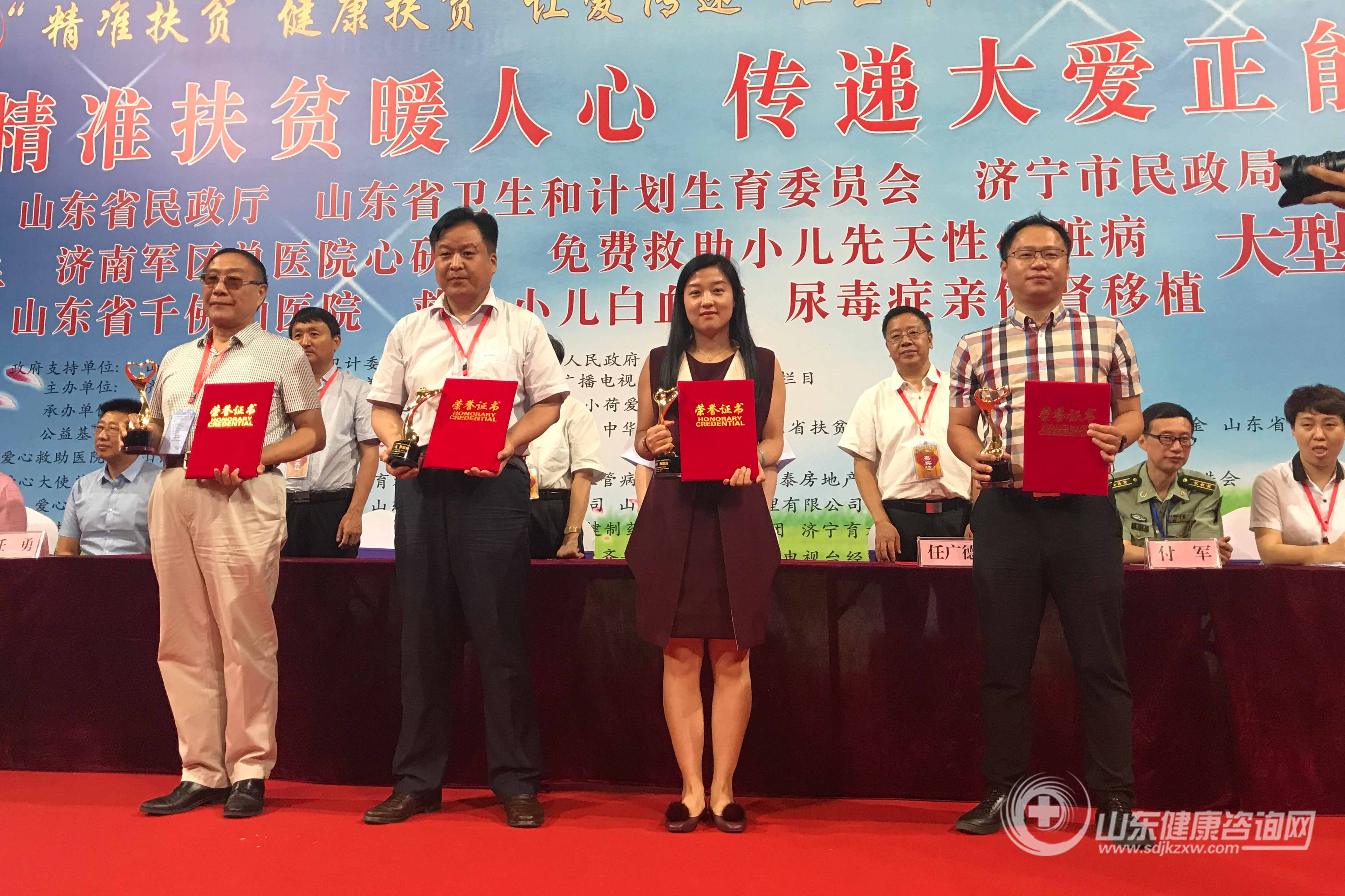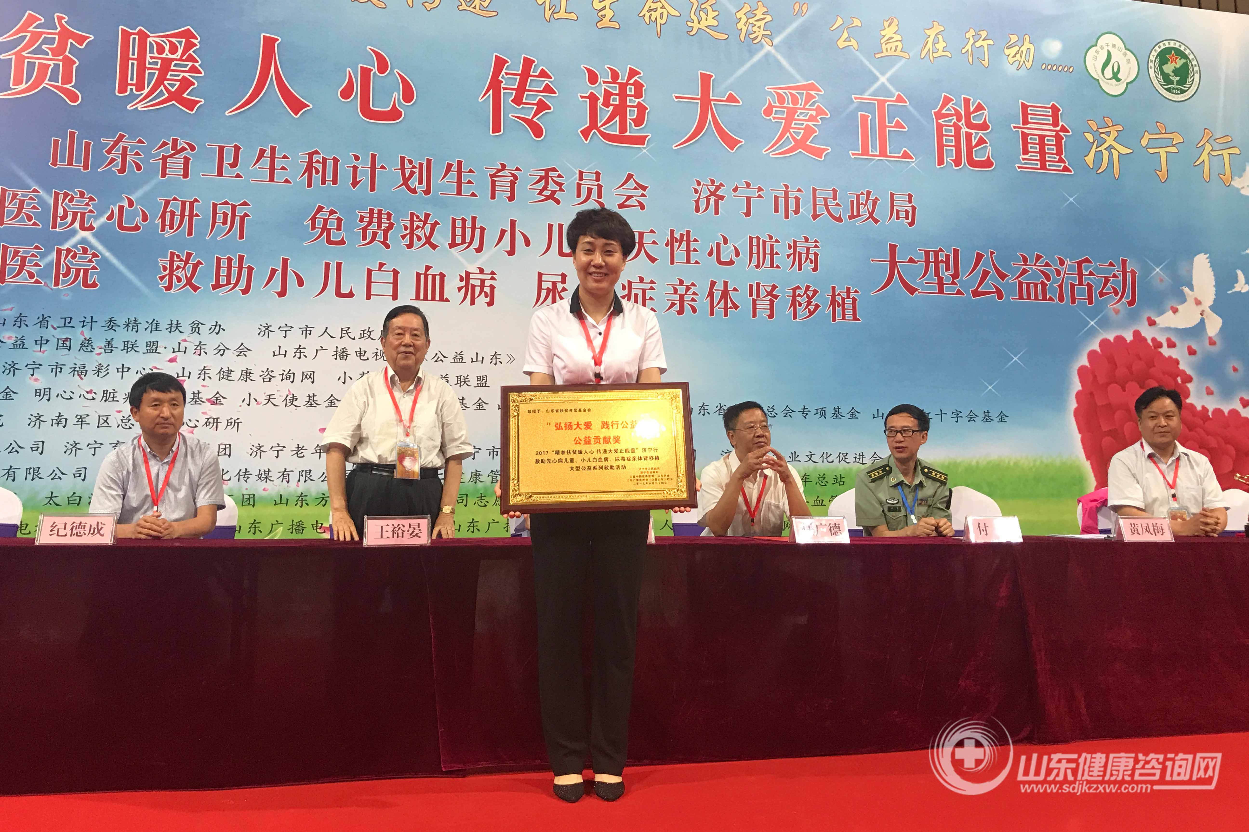 为山东省扶贫开发基金会颁发了“公益贡献奖”奖牌以表彰他们在公益救助活动中所作出的突出贡献。