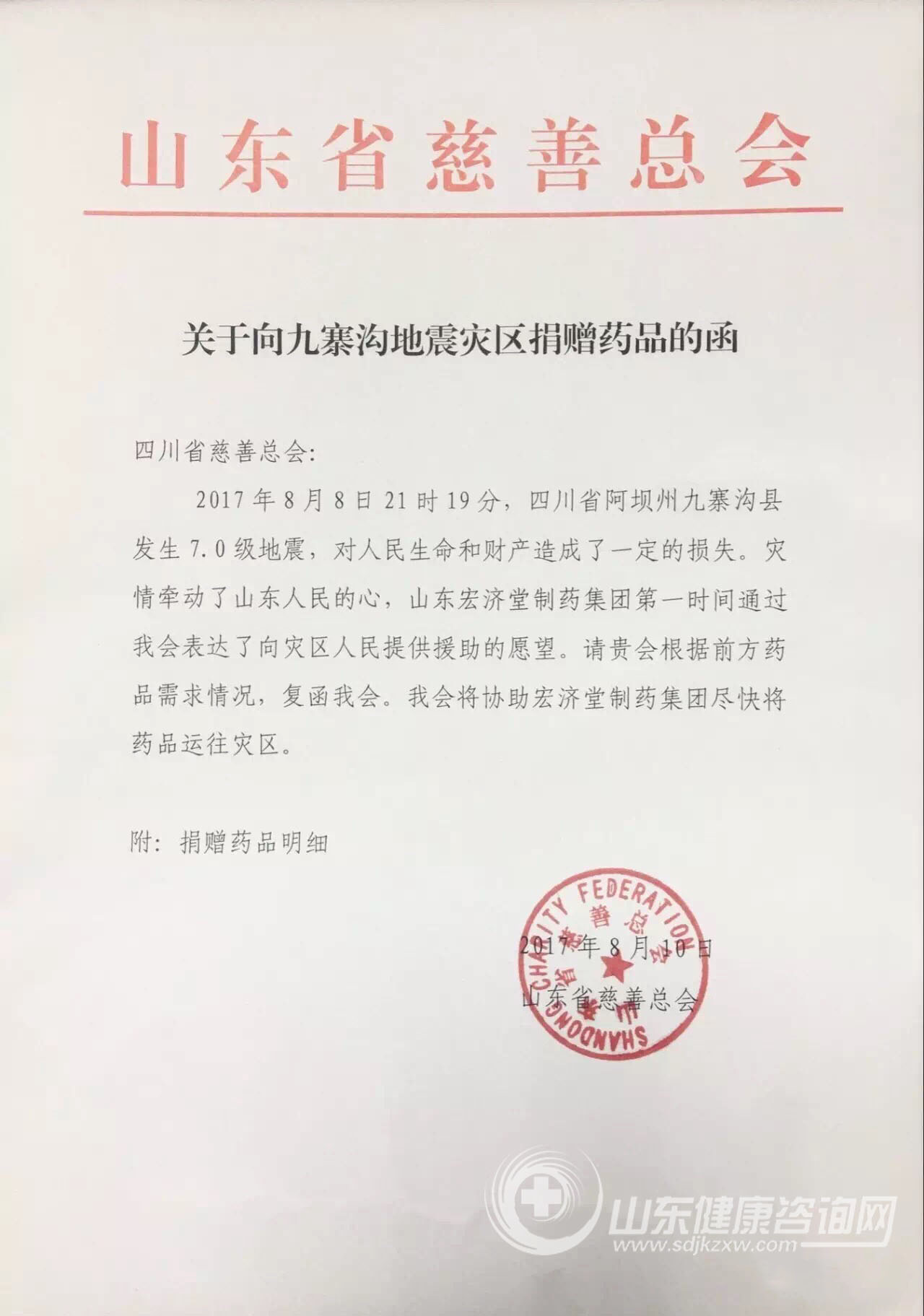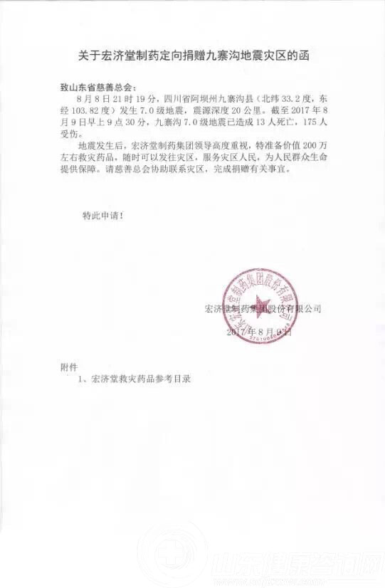 地震无情,人有情。地震灾情牵动了山东人民的心。山东宏济堂制药集团领导高度重视,8月9日,第一时间亲赴山东省慈善总会,希望通过山东省慈善总会向九寨沟地震灾区捐赠价值200万元救灾药品(药品可根据灾区需要提供),为受灾人民群众提供生命安全保障。