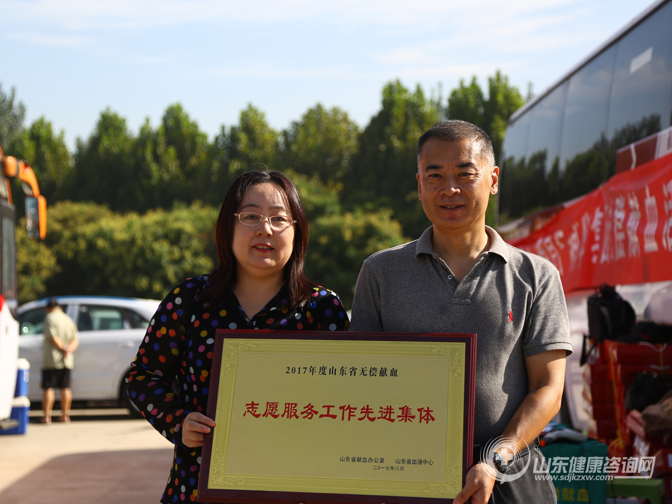 ▲山东省献血办公室副主任王淑荣向润华集团隋险峰总经理颁发荣誉奖牌