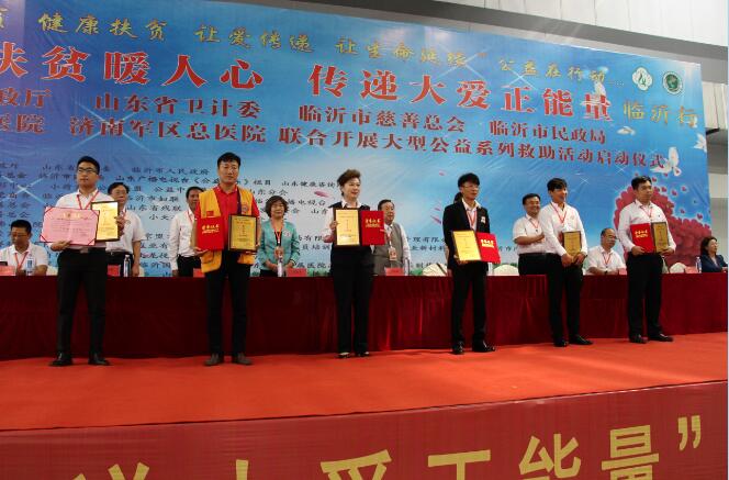 现场的领导为力诺集团董事长高元坤,山东省沂蒙商会秘书长卢炳开,北京京盟文苑投资有限公司董事长张庆余,金中证项目管理有限公司董事长杨明芬,仁宏医药集团董事长明磊,国家一级演员、山东省文联副主席唐爱国,国家著名影视演员李进荣,国家著名影视演员李槐龙颁发“爱心大使”奖杯和荣誉证书;
