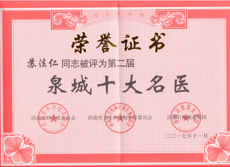 荣获第二届“泉城十大名医”荣誉称号