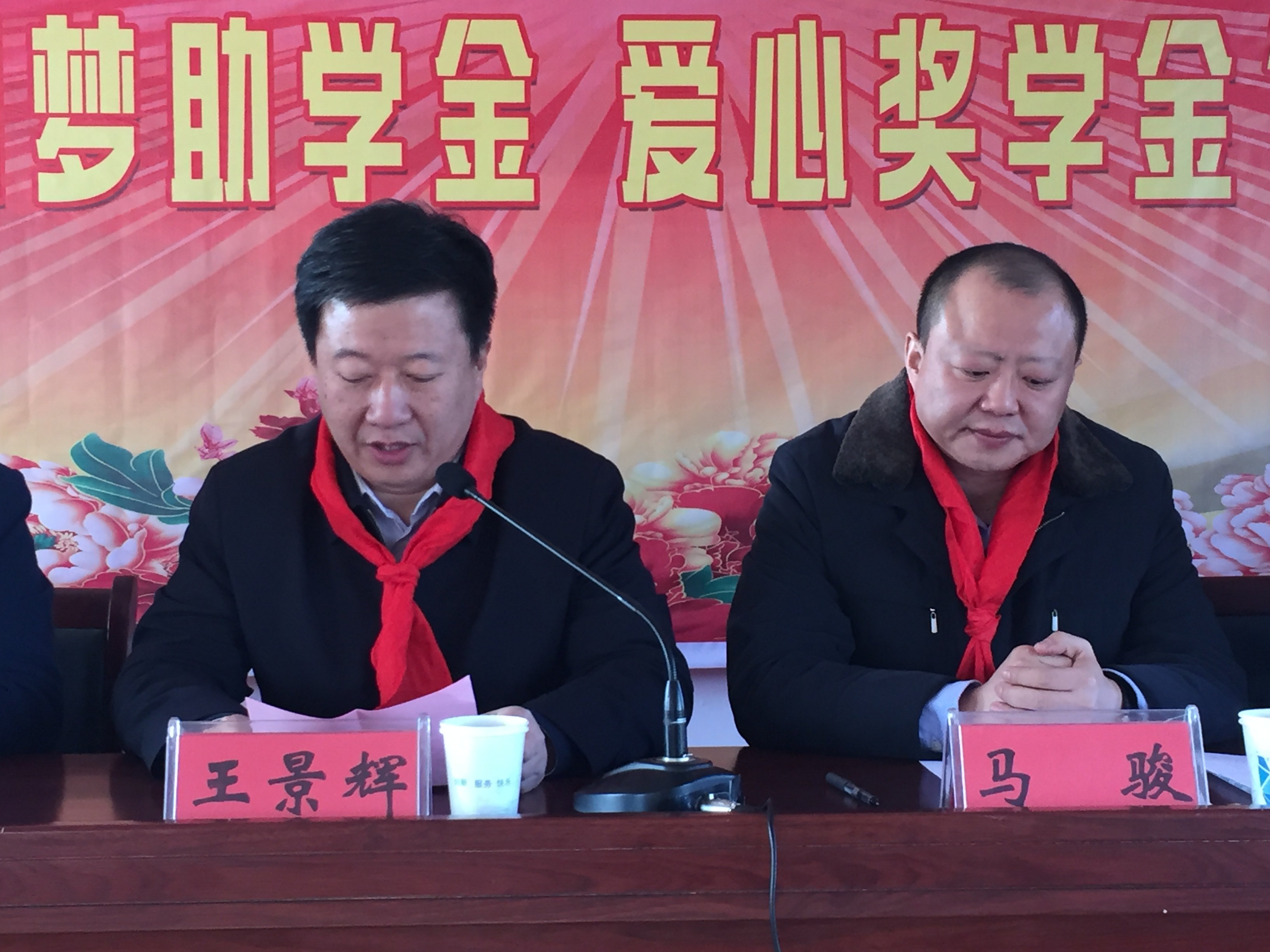 捐赠仪式现场,元邦投资集团马骏主席,山东省扶贫开发基金会王景辉秘书长分别为岸堤镇中心小学家庭困难学生发放捐助资金,为优秀学生、优秀教师代表发放奖励资金共计12.6万元。