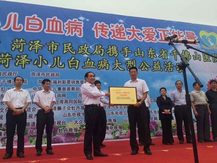 爱在初秋,相约菏泽!2015年9月11日,山东省民政厅、菏泽市民政局携手山东省千佛山医院和小天使基金会联合举办的“救助小儿白血病、传递大爱正能量”山东省首次救助小儿白血病大型公益救助活动在菏泽大剧院牡丹广场启动。山东省千佛山医院副院长 任勇、菏泽市副市长单立新、菏泽市民政局局长李士三、副局长葛广亮,菏泽市红十字会副会长张之轩等领导以及嘉宾出席公益救助活动,同时还有山东省千佛山医院的专家、医护代表、爱心企业、爱心团体、现场群众以及新闻媒体记者400余人参加了公益救助活动。