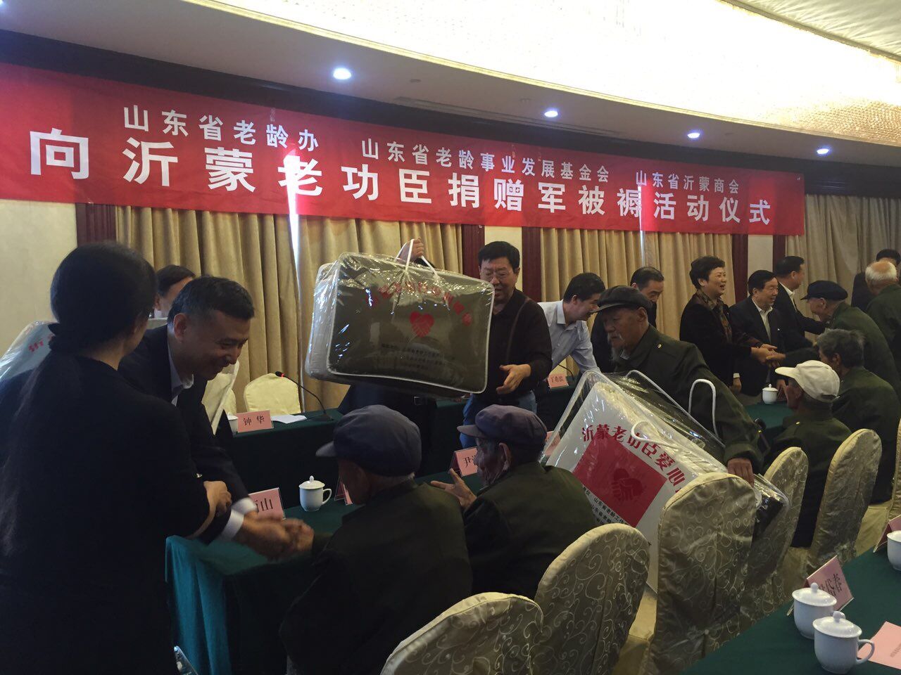 启动仪式上王玉晏省长带领现场领导嘉宾向沂蒙老功臣代表们捐赠了1000套爱心被褥,老功臣们激动不已,纷纷向领导表示要继续发光发热,为人民服务。