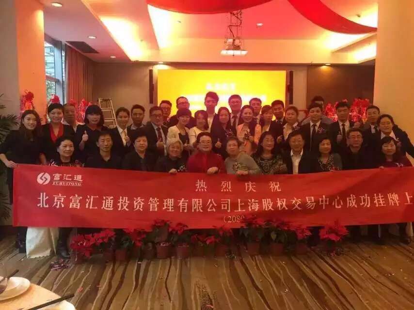 富诚汇信,通达民心!2015年11 月23日,北京富汇通投资管理有限公司在富汇通在上海股权托管交易中心Q版成功上市,中国企业家发展联合会名誉会长 原全国工商联副主席 王治国,“兆联天下”董事长 世界杨氏联谊会秘书长 杨秋萍,上海股权托管交易中心 机构代表 郑海成,北京富汇通投资管理有限公司董事长 山东泰山玉都公司董事长杨明新等领导嘉宾出席了敲钟挂牌仪式,还有来自杨氏联谊会的贵宾和富汇通vip客户,企业骨干等100多人参加了敲钟挂牌仪式。