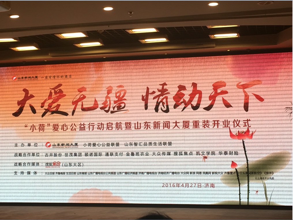 大爱无疆 ,情动天下 !2016年4月27日,由山东新闻大厦,“小荷”爱心公益联盟,山东智汇品质生活联盟共同发起的“大爱无疆 情动天下”爱心公益行动在社会各界爱心企业和爱心人士的汇聚下,在山东新闻大厦隆重启航。