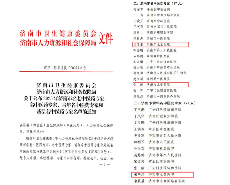 秉岐黄薪火 筑儿医新高 山东大学附属儿童医院史传奎、钟涛、张华炜入选济南市名中医药专家