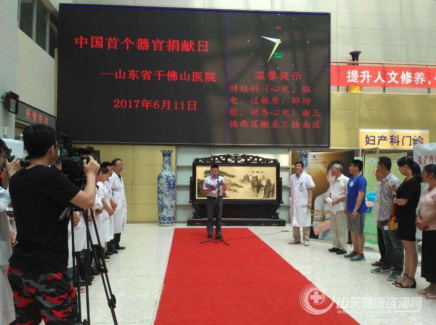 2017年6月11日中国首个器官捐献日山东省千佛山医院举行了隆重的纪念、科普宣传活动,山东省千佛山医院门诊部主任姚振东、宣传部部长毛瑞峰、山东省医学会器官移植专业委员会主任委员,山东省千佛山医院泌尿外科主任兼器官移植中心主任门同义和接受肾脏、肝脏和心脏移植的患者及其家属,器官捐献志愿者、普通群众100余人共同参与了中国首个器官捐献日的宣传纪念活动。