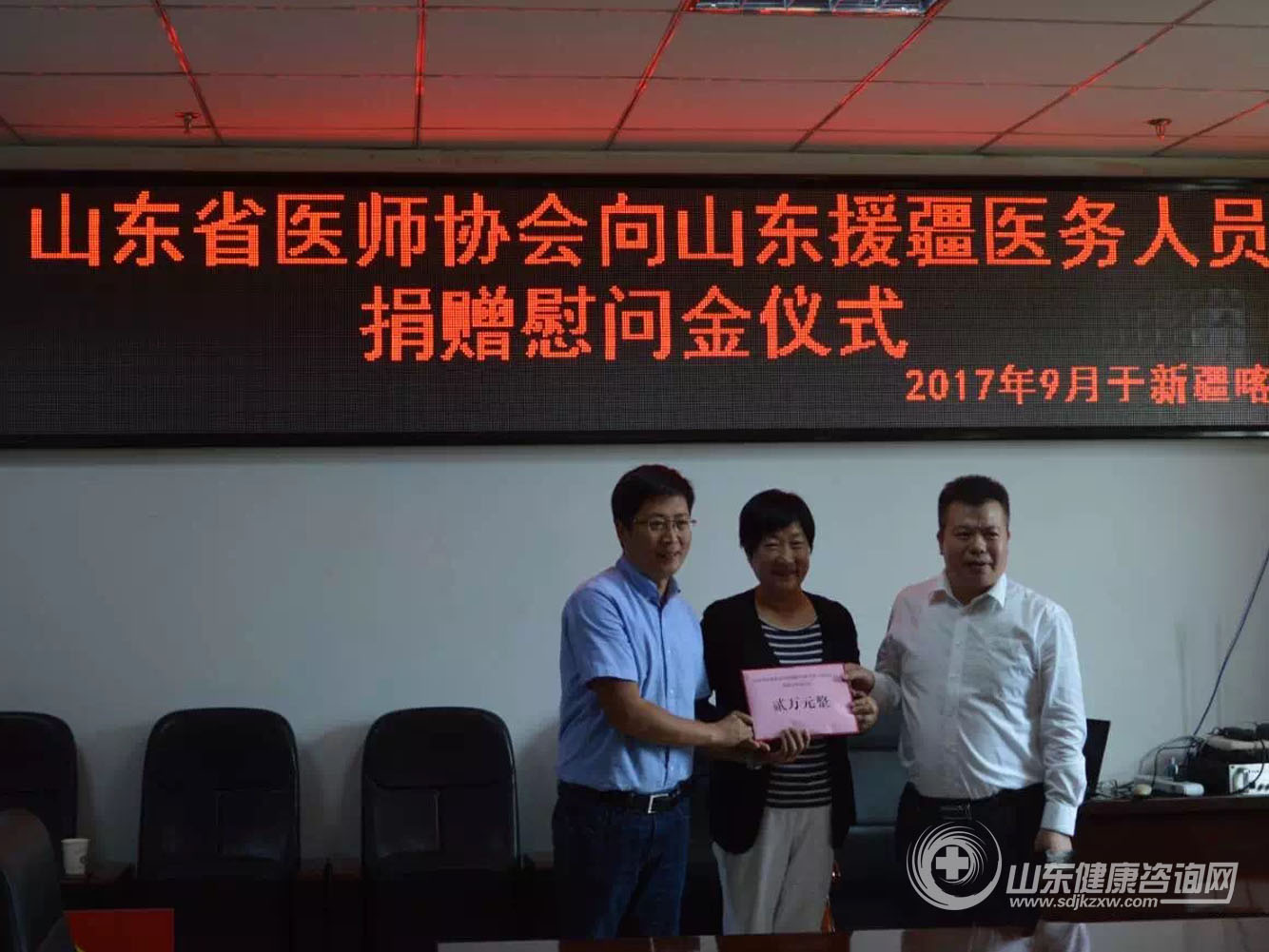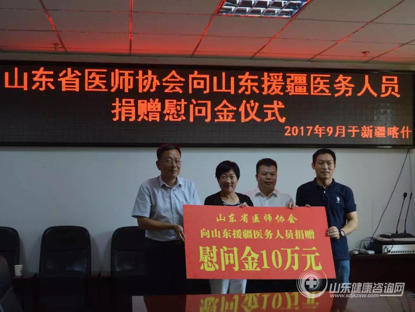 2017年9月12日,山东省卫生计生委、山东省医师协会慰问山东援疆医务人员座谈会暨“山东省医师协会鲁南制药医师关爱与发展基金”慰问金捐赠仪式在喀什地区肺科医院举行,山东省卫生计生委监察专员乞蔚国、山东省医师协会副会长兼秘书长宋良贞、山东省援疆指挥部党委副书记兼干部人才组组长邓泽宇、干部人才组副组长、喀什地区卫生计生委副主任耿林、山东援疆指挥部综合组副组长宋春、鲁南制药集团副总经理王义忠等领导出席。