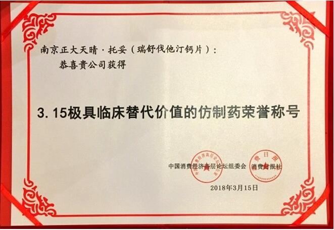 3月15日, 2018年“3.15中国消费市场行业影响力”品牌推广及颁奖盛典在北京歌华开元大酒店隆重举行,凭着良好的市场口碑和过硬的产品质量和疗效,南京正大天晴·托妥®(瑞舒伐他汀钙)以高票入围,被评为“3.15极具临床替代价值的仿制药”称号。