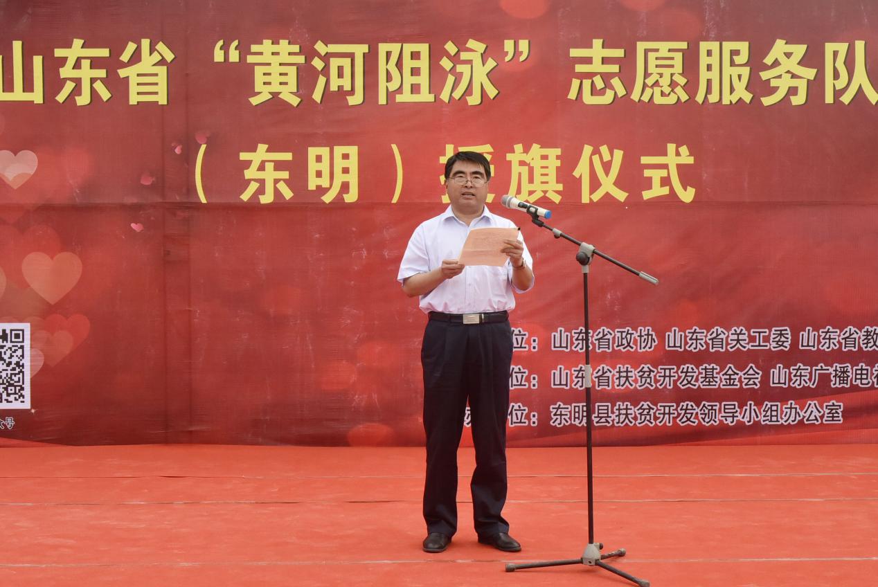 6月22日,由山东省扶贫开发基金会、山东广播电视台农科频道主办,东明县扶贫办承办的“黄河阻泳”志愿服务队(东明)授旗仪式,在东明县菜园集镇黄河滩区举行。山东省关工委副主任宋继峰,省政协原副秘书长、山东省儒商研究会常务副会长兼秘书长袁庆宏,山东省政协办公厅副主任、联合日报社社长朱兴刚,团省委副书记李子元,山东省扶贫开发基金会副理事长石长河,省政协办公厅宣传处处长李美华,省教育厅学校安全管理处副处长苏斌,省扶贫开发基金会秘书长王景辉,山东省广播电视台农科频道“一切为了群众栏目”制片人王静,省政协“民生连线”群众代表、黄河阻泳发起人王和新,爱心企业代表济南圣泉集团帮帮忙公司副总经理崔建伟等出席了活动。